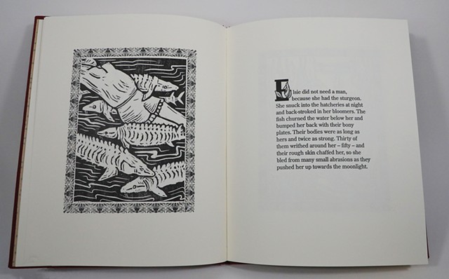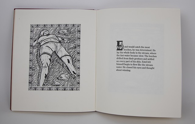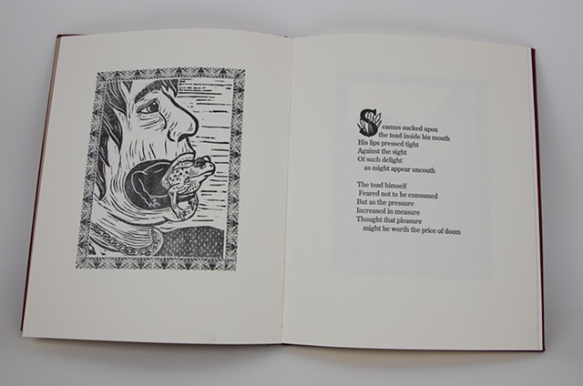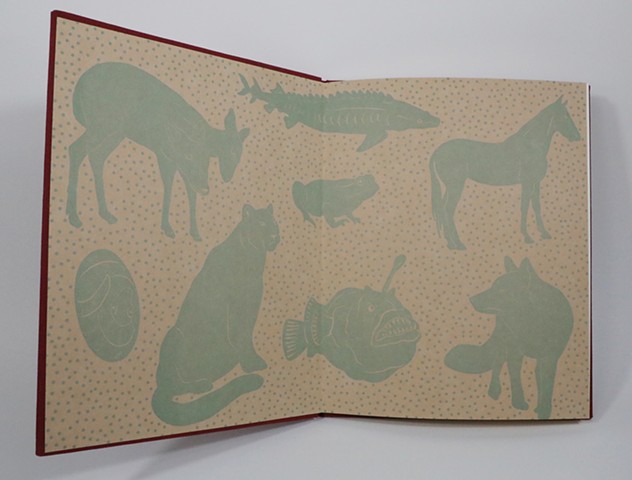 Familiar Fables is an artist book collaboration with speculative fiction writer Abbey Mei Otis. Together, Otis and I researched the literary and print history of Aesop’s fables and began a collaboration on interspecies intimacies. Abbey wrote a selection of contemporary fables based on chosen themes and I combined them with wood block prints, ornamental caps I designed and letterpress type. End pages and cloth bound artist book all echo historic children's book forms.